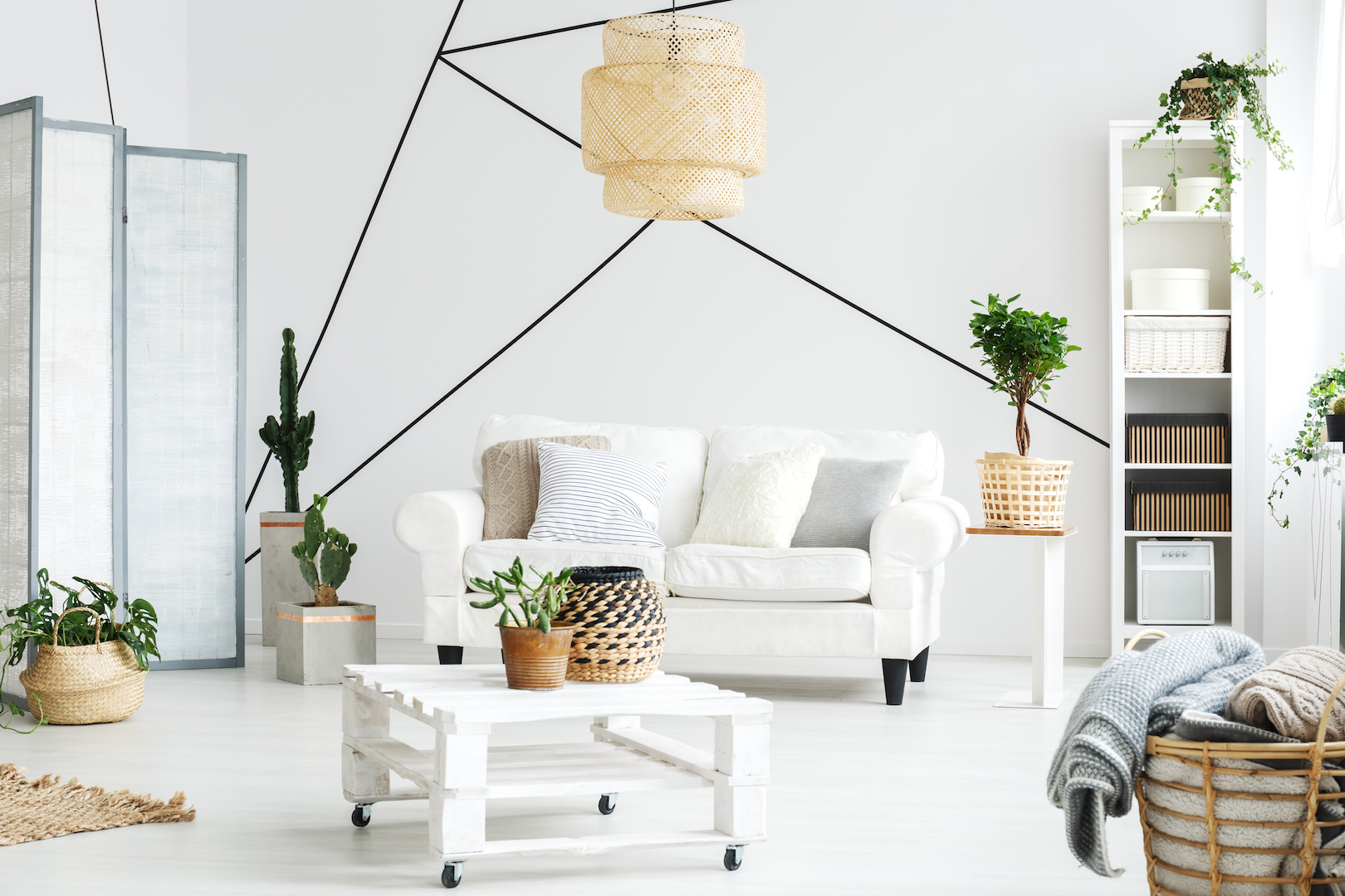 Wooden white coffee table and comfortable sofa in lounge